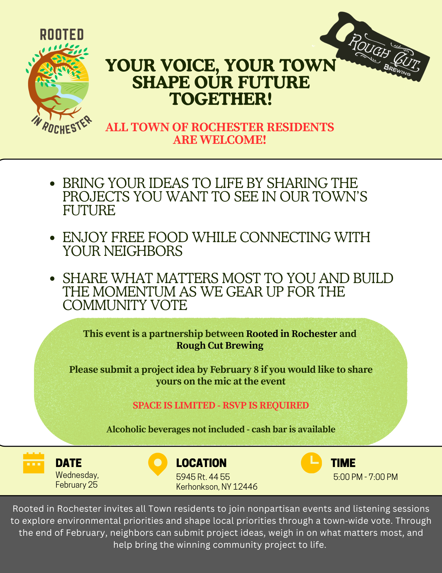 Rooted in Rochester is an environmentally-focused community listening campaign open to all Town of Rochester residents. Residents will be able to submit their local project ideas through the end of February 2026 and vote on their favorites in the spring.